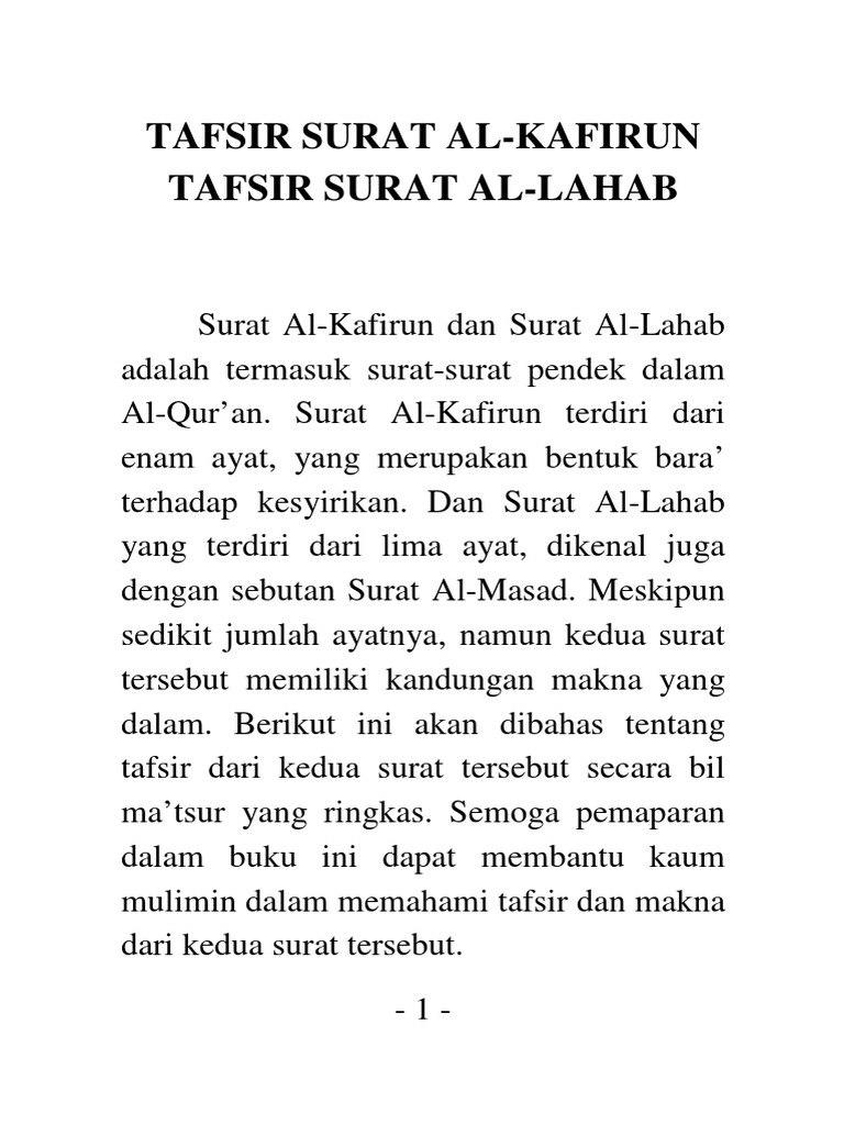 Differentiation Last update2011-06-15 Views8276 Arabic Source Praise be to Allah the Lord of Creations and Peace and blessings be upon our prophet Muhammad the faithful and the honest. Kumpulan berita seputar surat al kafirun Terkin Terbaru Hari Ini - - Surat Al-Kafirun Surat yang Sangat Ditakuti Iblis. Terdiri dari 6 ayat surat Al-Kafirun diturunkan di kota Makkah.