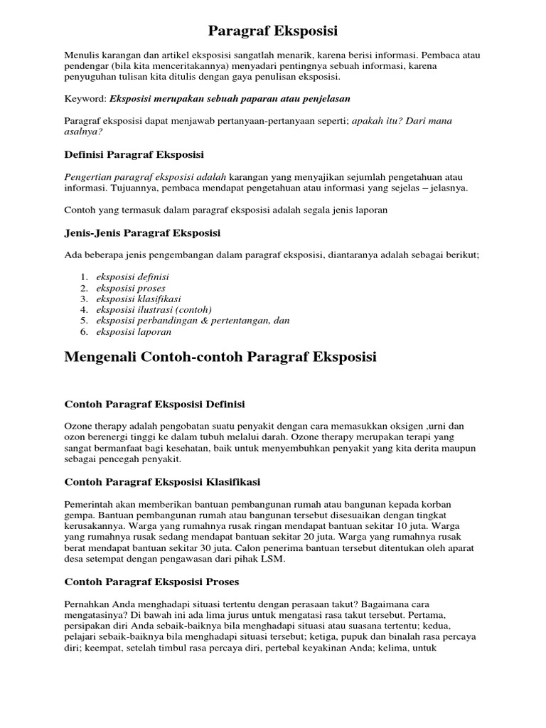 Terjawab terverifikasi oleh ahli. Ada beberapa jenis paragraf eksposisi. Jenis-jenis teks eksposisi beserta contohnya biasa ditemui pada berita atau petunjuk penggunaan suatu produk.