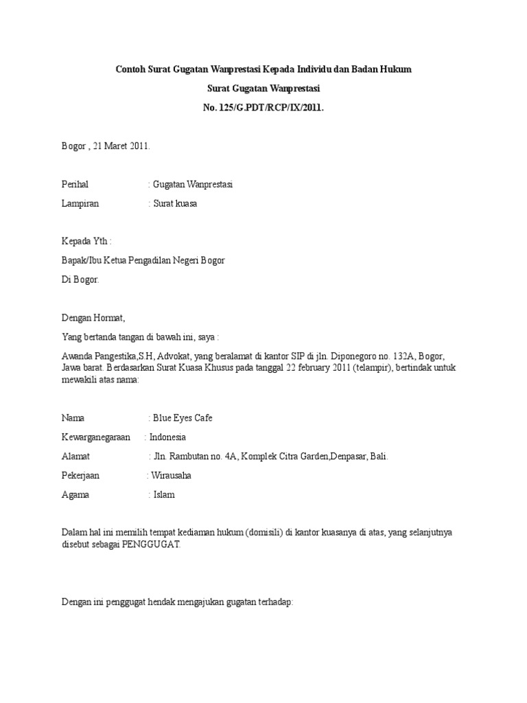 Contoh Surat Gugatan Perdata Wanprestasi Pdf